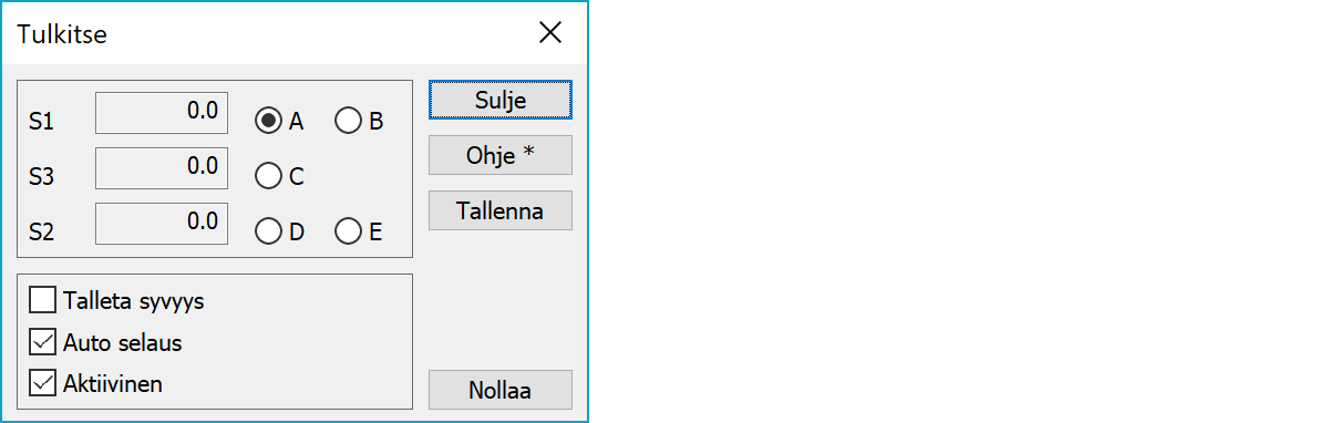 Tulkinta-toiminnolla määritetään kustakin syvyydestä 5 pistettä, joista lasketaan tunnusluvut S1, S2 ja S3. 1-käyrältä näytetään pisteet A, B ja C. 2-käyrältä pisteet D ja E. Osoitetut pisteet näkyvät ruudussa ja niitä voidaan myöhemmin muuttaa.