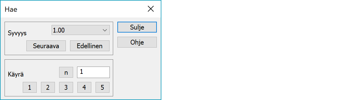 Hae-toiminnolla voit kelata syvyyksiä ja käyriä edestakaisin. Syvyyslistaan tulevat vain luetuissa tiedostoissa esiintyneet syvyydet. Käyrät 1-5 voidaan valita omilla napeillaan ja muut antamalla kenttään arvo ja painamalla n-näppäintä.