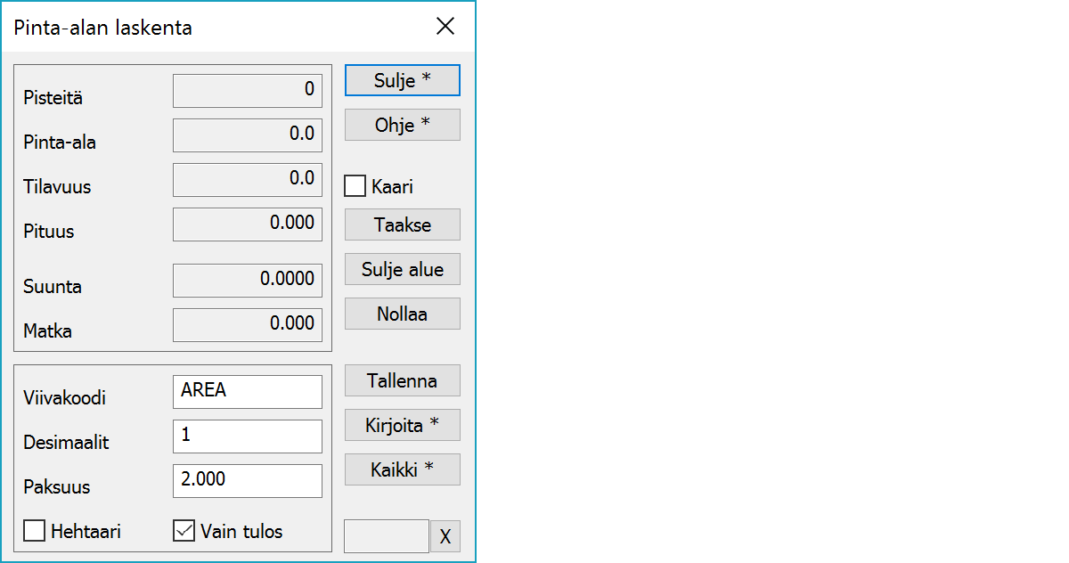 Laskee aktiivisen tiedoston kaikkien sulkeutuvien viivojen pinta-alat. Ctrl-näppäimen kanssa laskee vain valitut viivat. Tulokset tallennetaan tulostiedostoon viivakohtaisesti ja yhteensä, mutta pistekohtaisia tietoja ei tallenneta. Lasketut pinta-alat kirjoitetaan kunkin alueen painopisteeseen käyttäen edellisiä tekstiasetuksia. Shift-näppäimen kanssa voidaan tiedot tallentaa viivan ominaisuustietona. Yhteenlaskettu pinta-ala ja pituus näkyvät toiminnossa laskennan jälkeen ja ne voidaan kirjoittaa kuvaan Kirjoita-painikkeella.