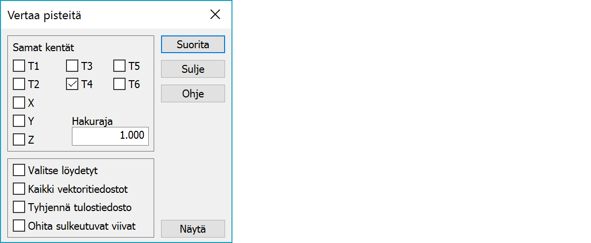 Vertailupisteiden hakeminen annetulle pistejoukolle ja koordinaattierojen laskenta. Shift-näppäimen kanssa valitsee kaikki hajapisteet, jos samassa kohdassa on viivapiste.
