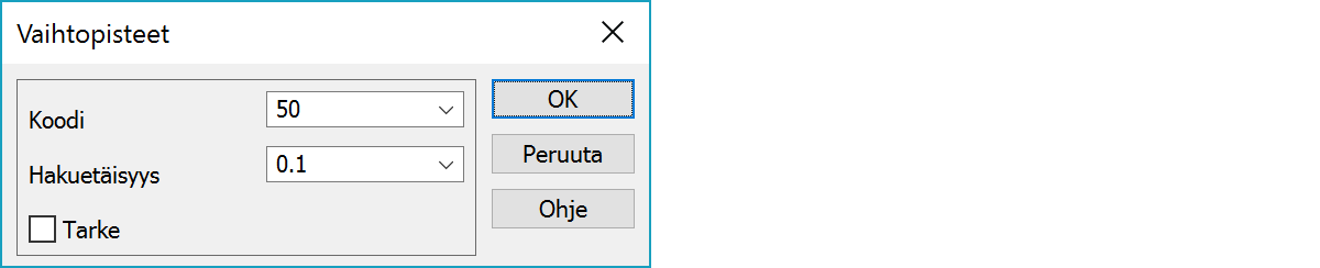 VaihtopisteetKun kahdelta kojeasemalta on mitattu sama piste, voidaan toiminnolla laskea pisteiden eromitta. Pisteet voidaan mitata joko hajapisteinä tai taiteviivoina. Vastinpisteille voidaan laskea eromitta ja tarkastella ruudussa tarkemittaustoiminnolla.