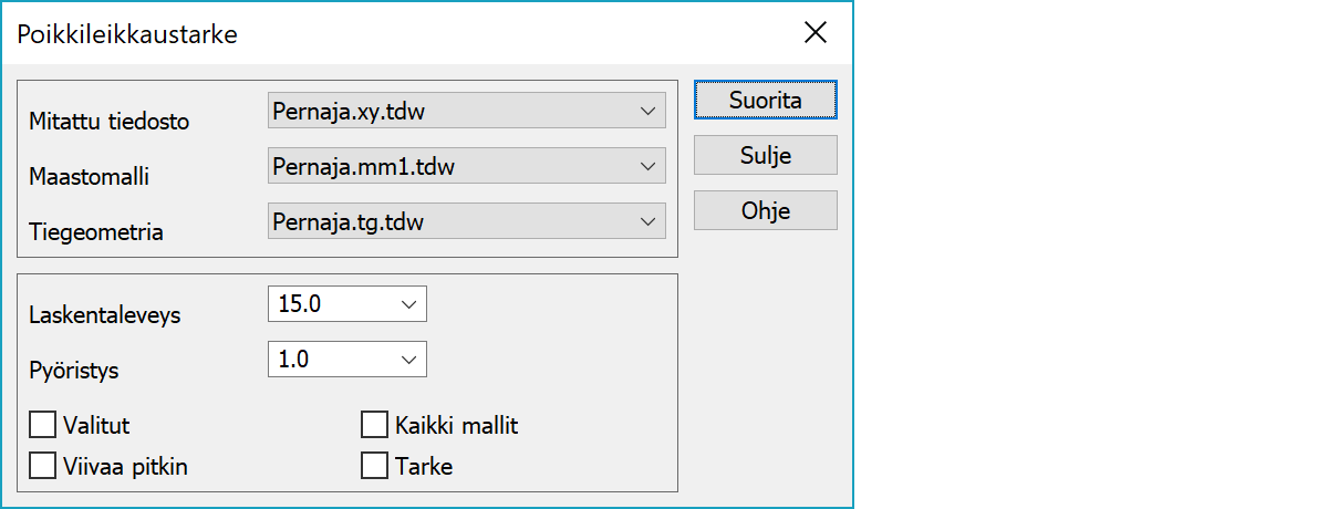 Jos rasti on päällä, poikkileikkaus lasketaan mitattua viivaa pitkin. Muuten mitatun viivan pisteet projisoidaan kohtisuoraan tiehen nähden. Samasta kohtaa lasketaan mallin poikkileikkaus. Poikkileikkauksen paaluluku on viivan päiden paalulukujen keskiarvo.