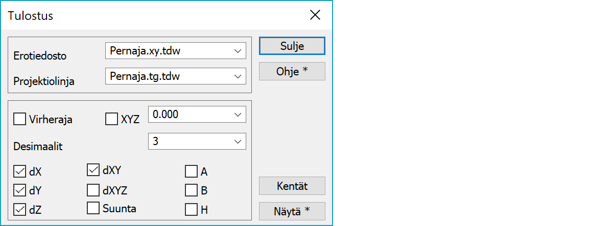 Voit valita, mitkä arvot tulostetaan tiedostoon. Sarakkeet dX,dY ja dZ tulevat aina mukaan tuloksiin, mutta arvoksi tulee tähti (*), jos arvon ei haluta tulostuvan. dXYZ kentän arvoon lasketaan vain ne komponentit, jotka on laskettu ja valittu tulostettaviksi. Dir on vaakavirheen (dXY) suunta gooneina.