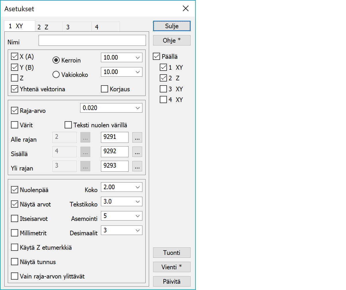 AsetuksetAsetuksilla määrätään, miten erotiedosto piirretään ruutuun. Kaikilla välilehdillä on kaikki samat asetukset ja kaikkia voidaan hallita erikseen. Niitä hyödyntämällä on mahdollista esimerkiksi näyttää XY- ja Z-virheet eri asetuksilla. Käytössä olevien asetusten välilehtien otsikkoon lisätään XYZ-asetusten arvot (esim. 1 XY tai 2 Z).