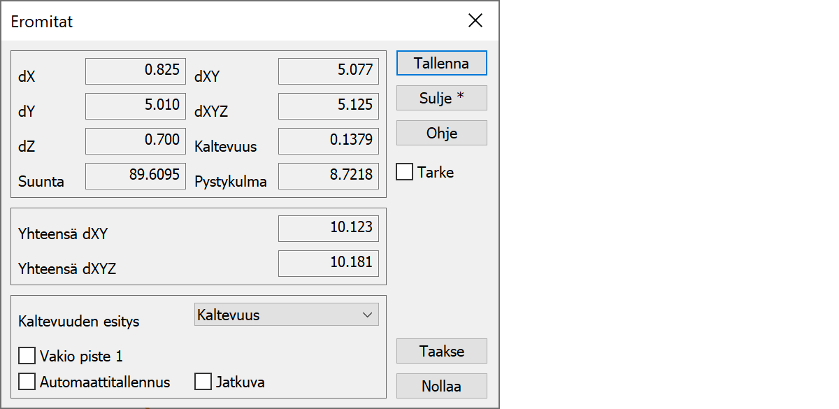 Matka dX dY dZ dXY dXYZ Kaltevuus Suunta Pystykulma