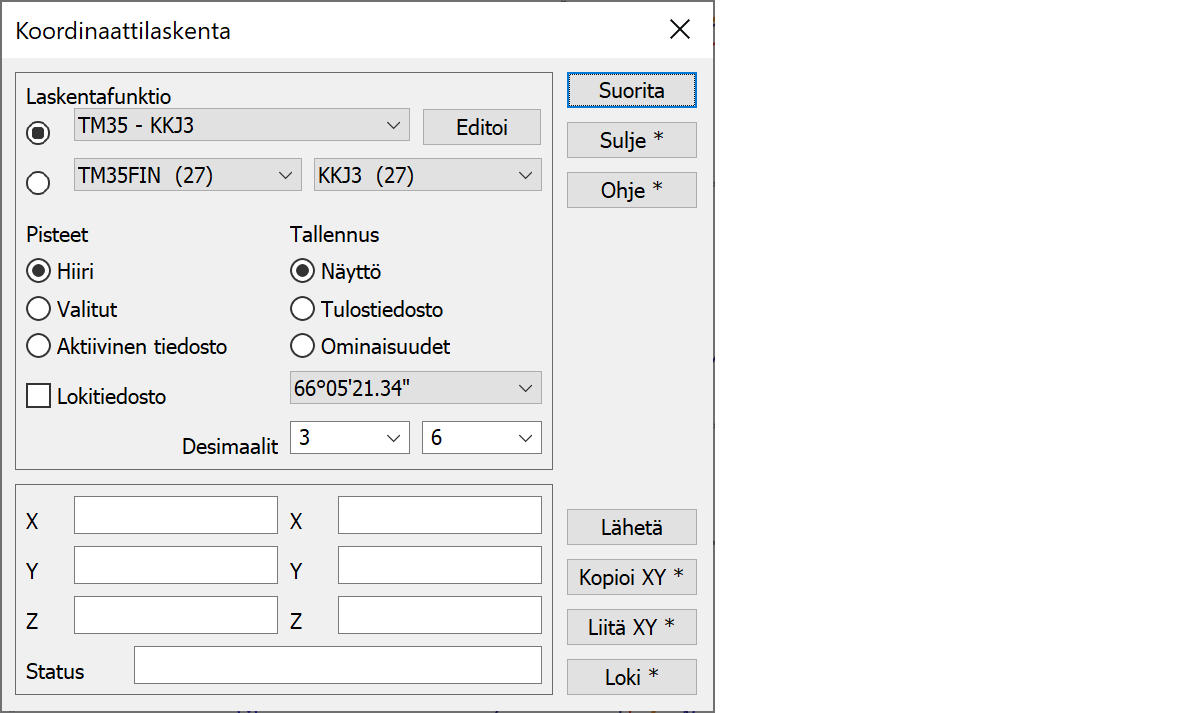 Koordinaatit ja laskennan tila. Jos muunnoksen ensimmäisen funktion lähdekoordinaatti on maantieteellinen tai koordinaattijärjestelmän lähtöjärjestelmä on WGS84, voidaan vasemman puolen koordinaattikenttiin kirjoittaa myös minuutit ja sekunnit millä tahansa ei-numeerisella merkillä erotettuna (esim. 60°22'53.96911" tai 60 22 53.96911). Vastaavasti jos muunnoksen viimeisen funktion tuloskoordinaatti on maantieteellinen tai koordinaattijärjestelmän tulosjärjestelmä on WGS84, formatoidaan oikeanpuolisiin kenttiin arvot listalta valittuun muotoon.