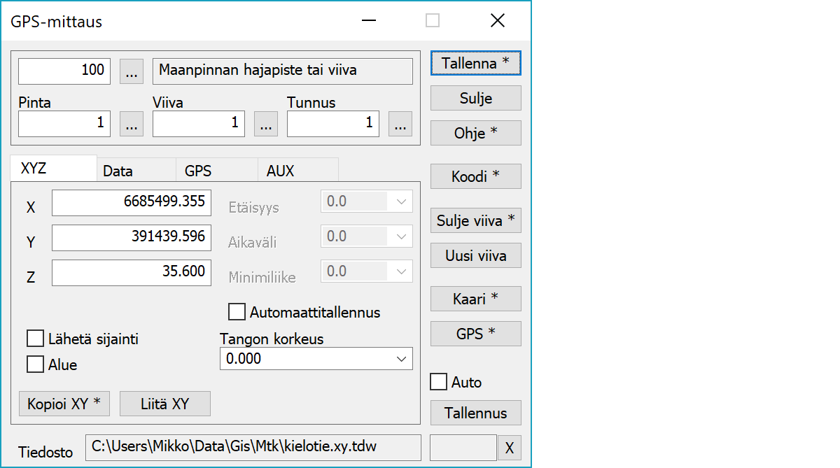 GPS-mittausMittaus ulkoisen tai laitteen sisäisen GPS:n avulla. Toimii pääsääntöisesti kuten Pisteen lisäys, mutta hiiren sijasta koordinaatti tulee GPS-laitteelta.