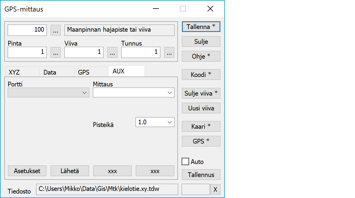 GPS-mittausMittaus ulkoisen tai laitteen sisäisen GPS:n avulla. Toimii pääsääntöisesti kuten Pisteen lisäys, mutta hiiren sijasta koordinaatti tulee GPS-laitteelta.