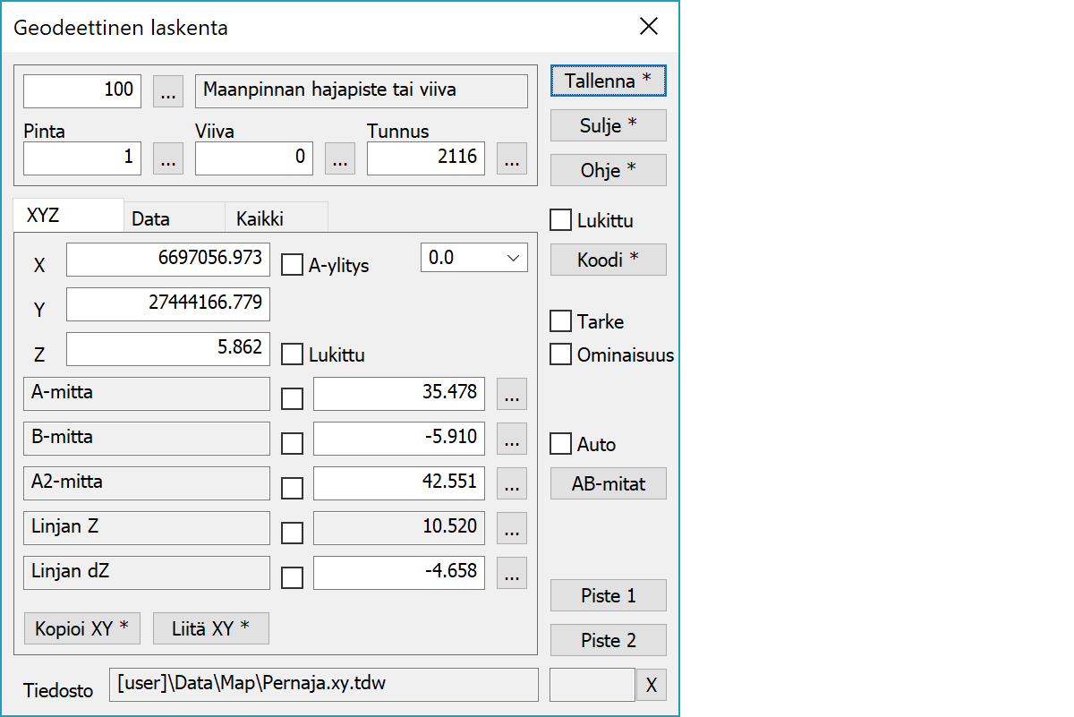 Geodeettinen laskentaSäteittäinen, suorakulmainen ja geodeettinen laskenta ovat periaatteessa yksi ja sama toiminto, mutta kunkin voi asettaa erikseen laskemaan tiettyjä tuloksia. Osoita ensin vertailusuoran pisteet P1 ja P2. Tämän jälkeen voit joko osoittaa muita pisteitä ja laskea arvoja ruutuun ja tulostiedostoon, tai syöttää dialogin kenttiin arvoja ja laskea uusia koordinaatteja.