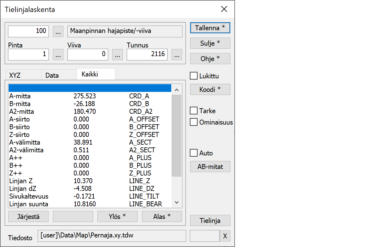 Jos kairapisteille tallennetaan CRD_A- tai CRD_B-ominaisuuksia, ne kopiodaan myös pisteen A- ja B-mitoiksi. Kairapisteen viivanumeroksi kenttään T2 tulee referenssilinjan nimi, joka on taiteviivan tapauksessa viivanumero tai tielinjan tapauksessa tiegeometrian tiedostonimi ilman päätettä.