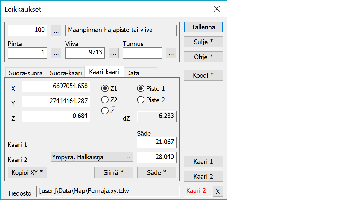 Kaarien osoitusmenetelmä valitaan listasta. Säde-kentät näyttävät kaarien säteet.