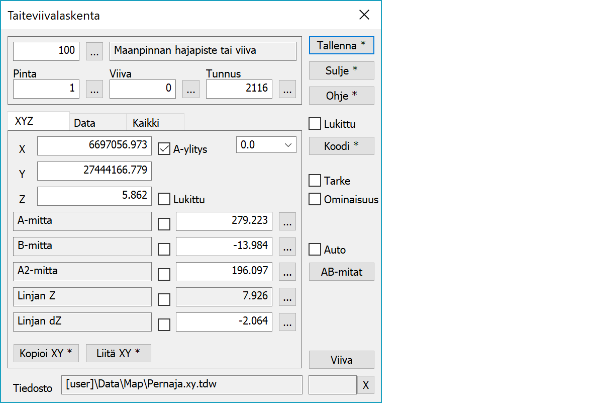 TaiteviivalaskentaLaskentaikkuna, jossa voit tehdä kartoitusta ja merkintää taiteviivan suhteen. Osoita ensin vertailulinjana toimivaa taiteviivaa. Tämän jälkeen voit joko osoittaa muita pisteitä ja laskea arvoja ruutuun ja tulostiedostoon, tai syöttää dialogin kenttiin arvoja ja laskea uusia koordinaatteja.