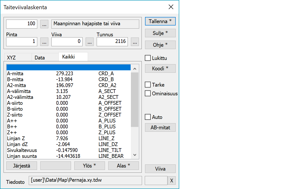 TaiteviivalaskentaLaskentaikkuna, jossa voit tehdä kartoitusta ja merkintää taiteviivan suhteen. Osoita ensin vertailulinjana toimivaa taiteviivaa. Tämän jälkeen voit joko osoittaa muita pisteitä ja laskea arvoja ruutuun ja tulostiedostoon, tai syöttää dialogin kenttiin arvoja ja laskea uusia koordinaatteja.