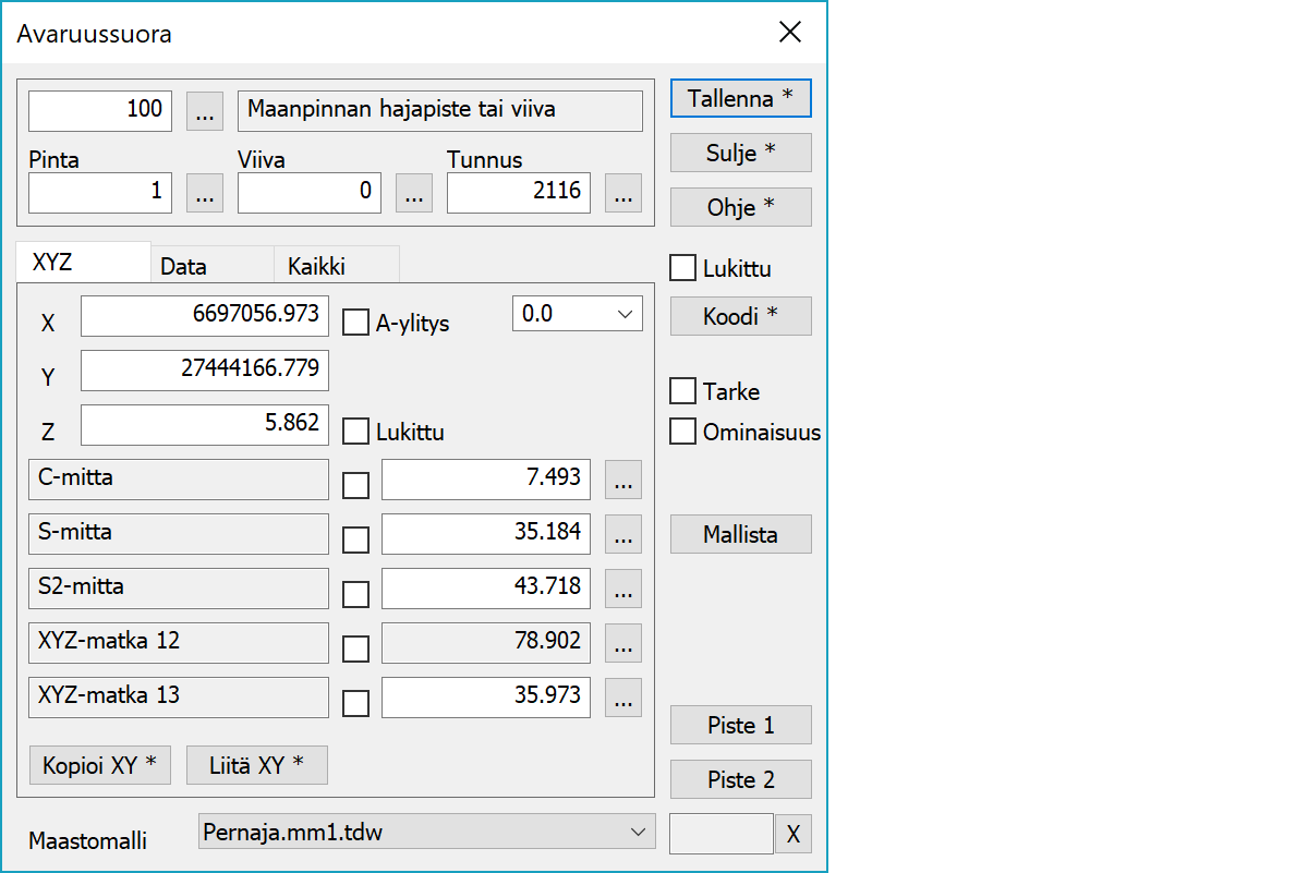 AvaruussuoralaskentaKolmiulotteinen AB-laskenta. Osoita ensin vertailusuoran pisteet P1 ja P2. Tämän jälkeen voit joko osoittaa muita pisteitä ja laskea arvoja ruutuun ja tulostiedostoon, tai syöttää dialogin kenttiin arvoja ja laskea uusia koordinaatteja.