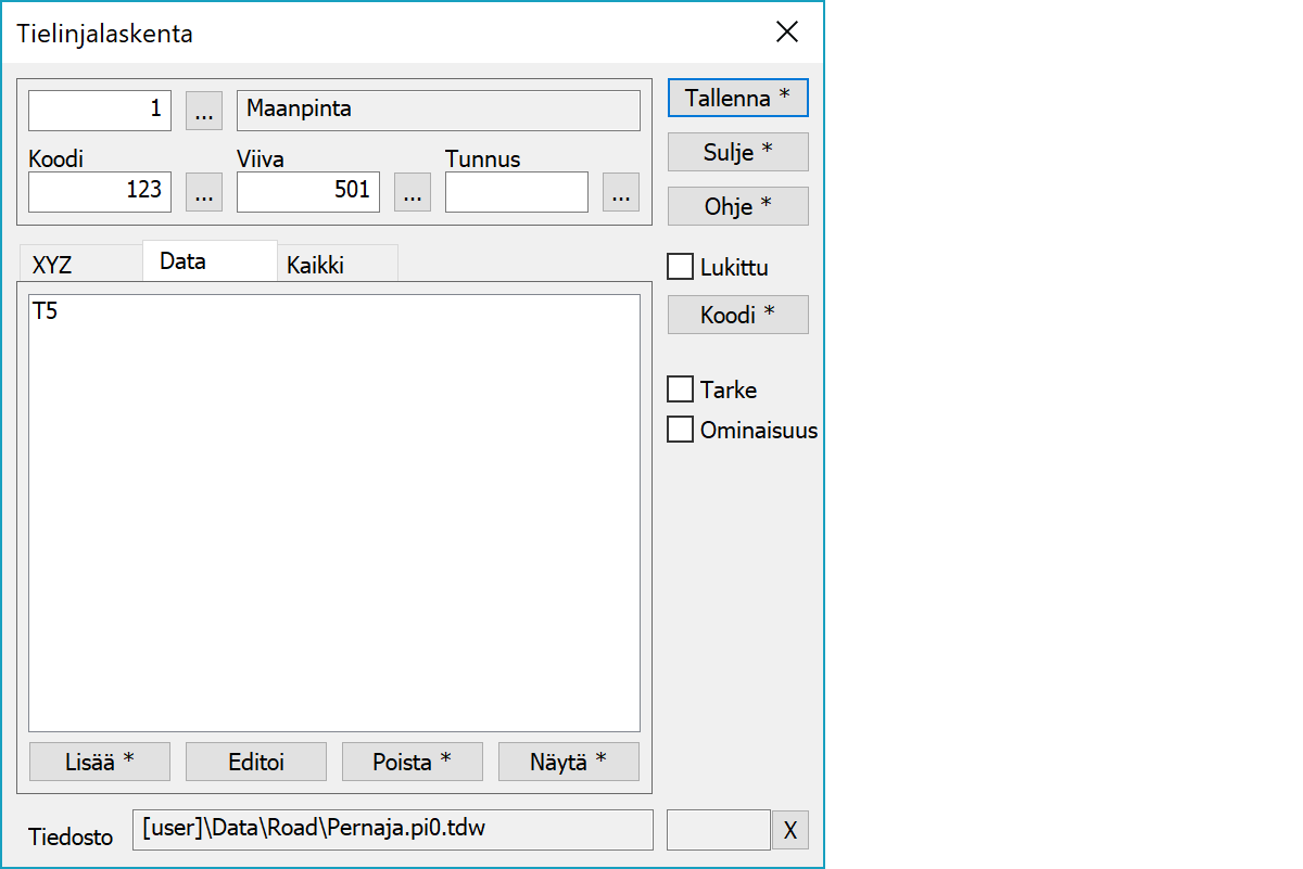 TielinjalaskentaLinjalaskenta pystygeometriasta käyttää referenssilinjana tien pystygeometriaa. Osoita ensin vertailulinjana toimivaa pystygeometriaa. Tämän jälkeen voit joko osoittaa muita pisteitä ja laskea arvoja ruutuun ja tulostiedostoon, tai syöttää dialogin kenttiin arvoja ja laskea uusia koordinaatteja.