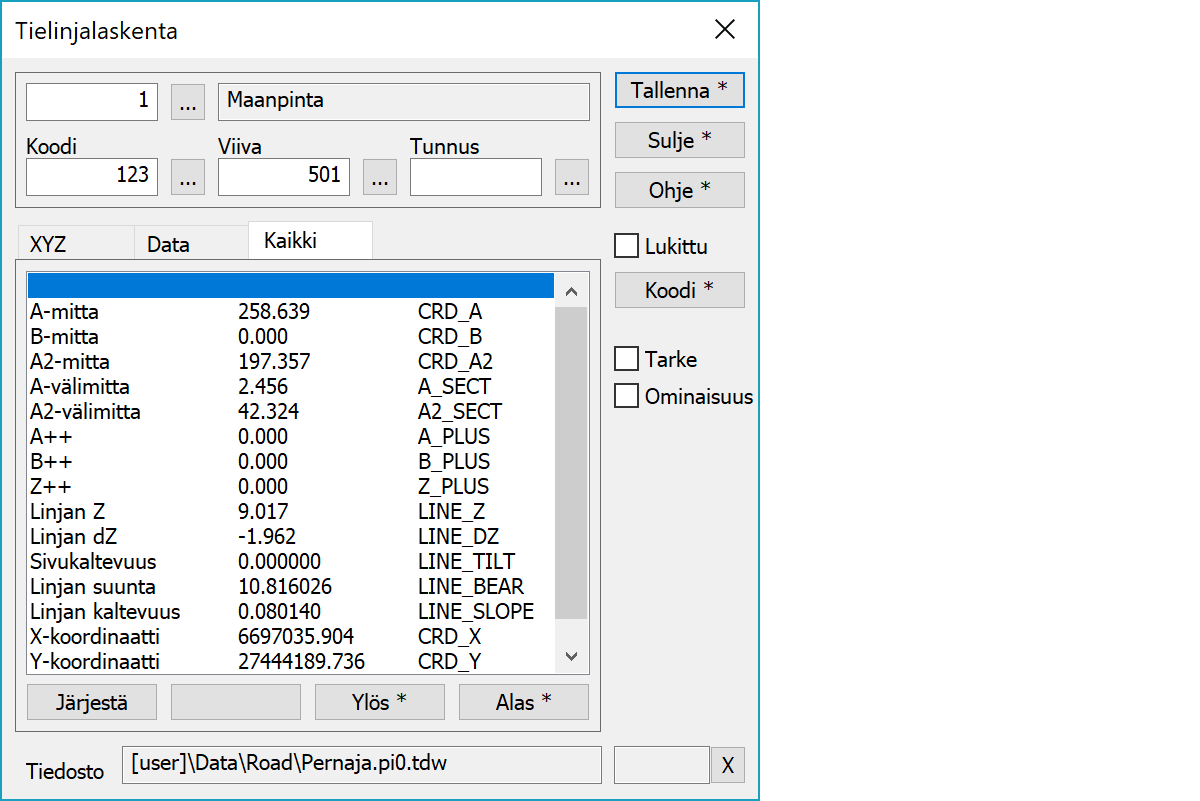 TielinjalaskentaLinjalaskenta pystygeometriasta käyttää referenssilinjana tien pystygeometriaa. Osoita ensin vertailulinjana toimivaa pystygeometriaa. Tämän jälkeen voit joko osoittaa muita pisteitä ja laskea arvoja ruutuun ja tulostiedostoon, tai syöttää dialogin kenttiin arvoja ja laskea uusia koordinaatteja.