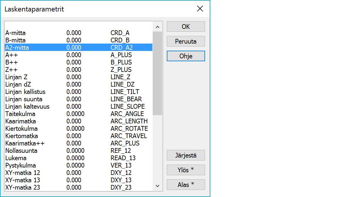 Kunkin parametrin nimen jälkeen suluissa tuleva tunnus on ominaisuustiedon nimi, jolla tulos voidaan tallentaa pisteelle. Kaikki parametrit eivät ole käytössä kaikissa laskentatoiminnoissa.