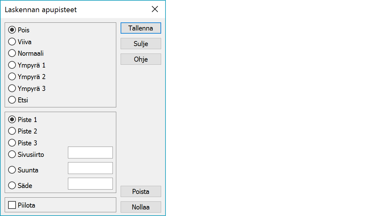 Apupisteiden laskentaToiminnolla voidaan luoda näytölle apuviivoja, jotka toimivat esimerkiksi kaavalaskennan apuna. Apuviivat voivat olla joko suoria tai ympyröitä ja kaikkiin niiden leikkauspisteisiin voidaan tarttua hiiri XYZ -hakutavalla. Hakutapa lähin piste ei toimi, koska pisteet eivät ole normaaleja elementtilistan tiedostojen pisteitä.