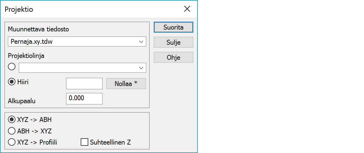 Muunnoksen suunta joko koordinaateista tasolle tai päinvastoin. XYZ -> Profiili tekee muunnettavasta aineistosta pituusleikkauskuvan.