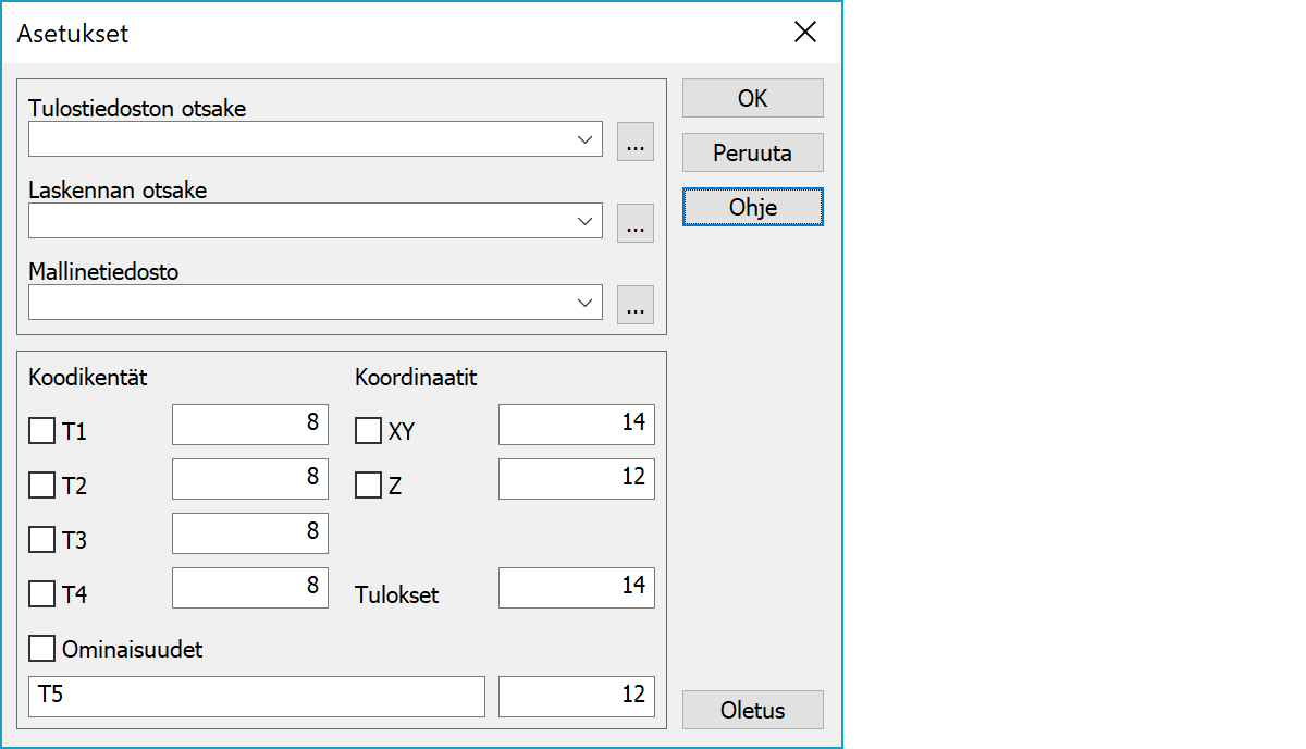 Asetukset XY- ja Z-koordinaattien kirjoittamiseen. Numeeriset arvot ovat kenttien leveydet tulostiedostossa.