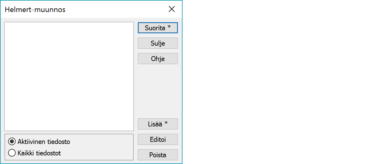 Koordinaatistomuunnos tiedostosta luettavilla parametreilla. Listassa näytetään käyttäjän asetushakemistossa ja yhteishakemistossa olevat HEL- ja AFF-tiedostot, joissa on määriteltynä Helmert-muunnoksen parametrit.