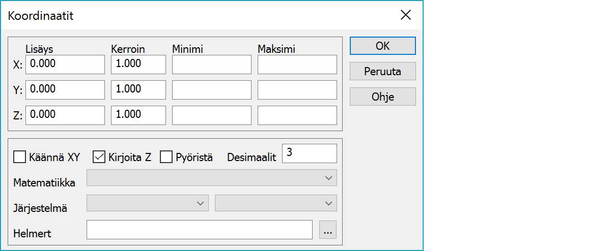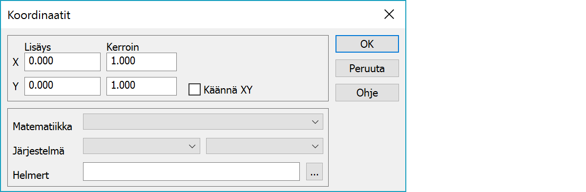 Koordinaattimuunnokset tehdään luettaessa järjestyksessä: Käännä XY, Kertominen, Lisäys, Matematiikka, Järjestelmä, Helmert, Rajojen tarkistus