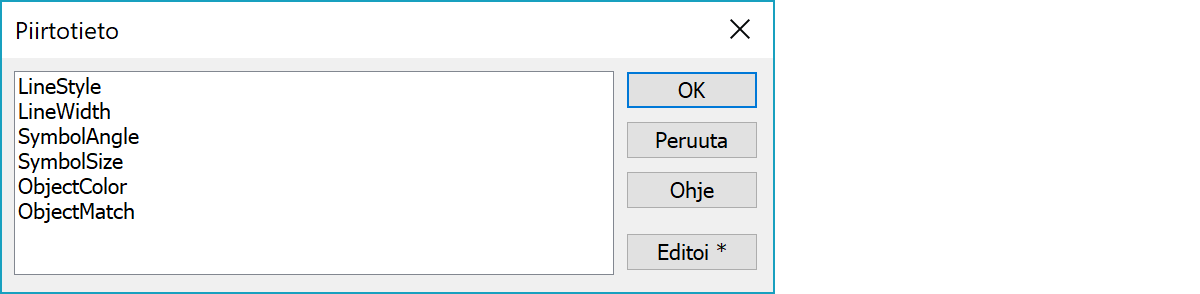 LineStyle ja LineWidth -kentät mahdollistavat viivan piirtotyylin ja leveyden kirjoittamisen tai lukemisen ominaisuudesta. SymbolAngle ja SymbolSize -kentät puolestaan mahdollistavat pisteen kulman ja koon kirjoittamisen tai lukemisen ominaisuuksista. Text-formaatilla kulma voidaan lukea tai kirjoittaa myös käyttämällä määreitä D, G tai T. ObjectColor-kentällä voidaan määrätä kohteen väri RGB-arvona.