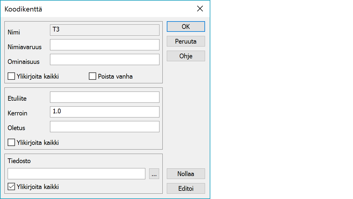 Kentillä T2 (viivanumero) ja T4 (pistenumero) asetus tarkoittaa automaattisen uudelleennumeroinnin alkuarvoa. Kaikille muille kentille se on oletusarvo. Ylikirjoita kaikki -asetus määrää, käytetäänkö oletusta kaikille pisteille (korvaa alkuperäisen) vai lisätäänkö se ainoastaan niille, joiden ko. kenttä on tyhjä.