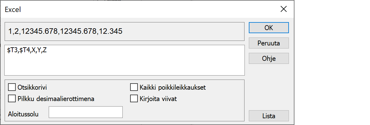 Rivit luetaan ja kirjoitetaan oletuksena alkaen solusta A1. Aloitussolu-asetuksella tätä voidaan muuttaa. Kummassakin tapauksessa formatointiin riittää kenttien (sarakkeiden) listaus (esim. T1 T2 T3 T4 X Y Z).
