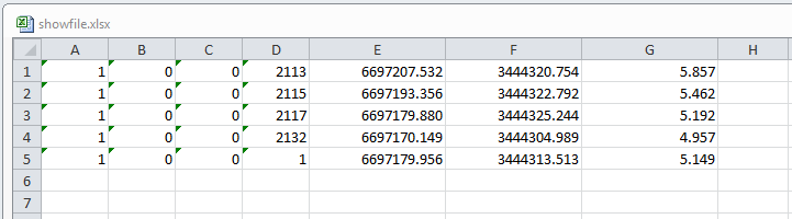 Formaattimääritys annetaan soluun, josta koordinaattilistaus alkaa. Se annetaan makrolla #DATAFILE ja sen perään itse määritys. Esimerkiksi: