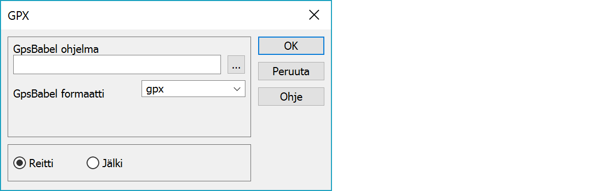 GpsBabel formaatin nimi luettaessa tai kirjoitettaessa. Katso GpsBabelin ohjeista tuetut formaatit.