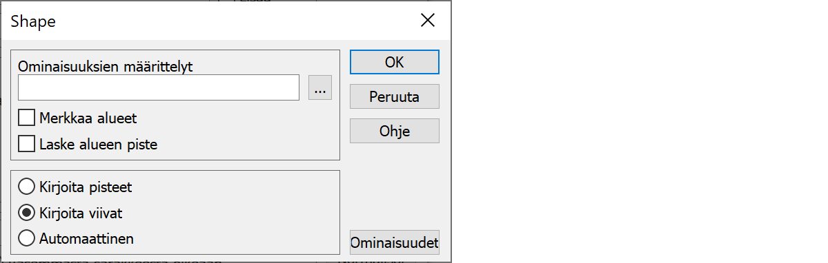 Jos olet valinnut kirjoitettavaksi pisteet, ohjaintiedostoon kirjoitetaan vain pisteiden ominaisuusmäärittelyt. Vastaavasti jos olet valinnut kirjoitettavaksi viivat, ohjaintiedostoon kirjoitetaan vain viivojen ominaisuusmäärittelyt.