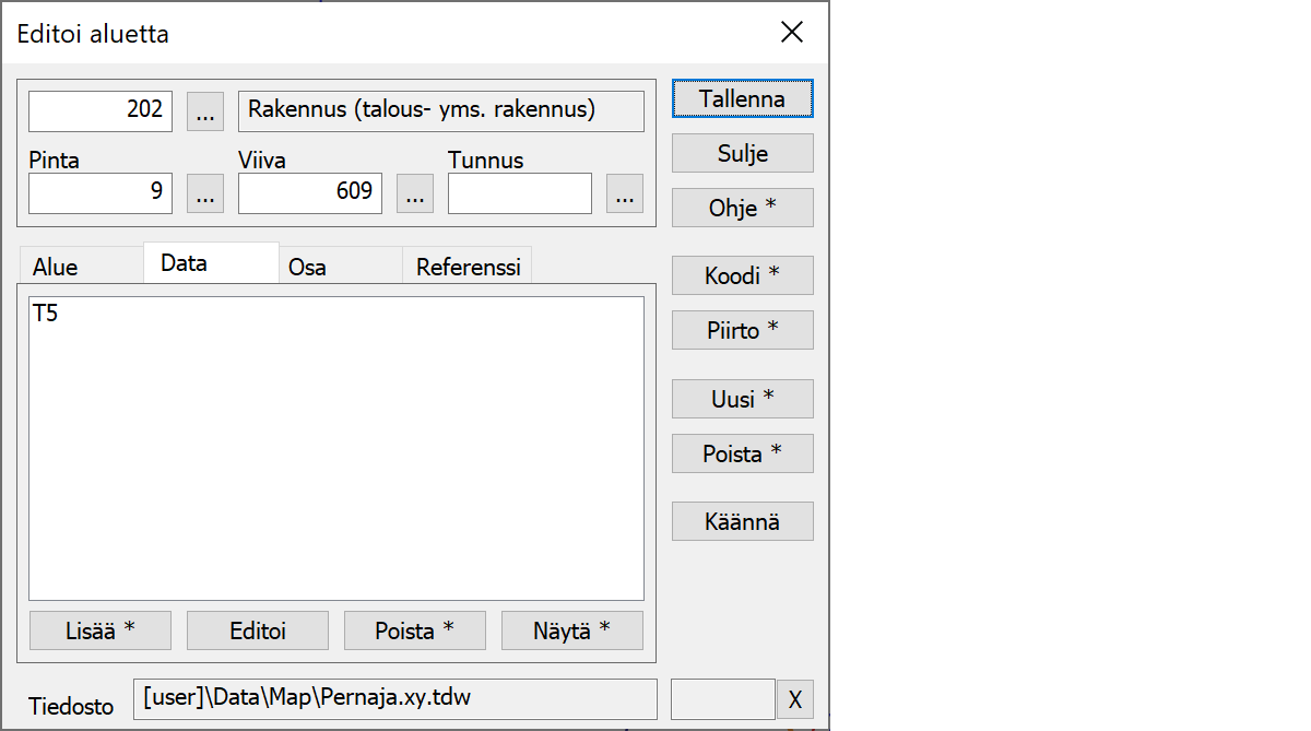 Editoi aluettaAlueiden editointitoiminnot. Alue aktivoidaan osoittamalla hiirellä sen sisäpuolta. Jos mahdollisia alueita on useita, aktivoidaan niistä oletuksena pienin. Jos hakutapa-asetus Samat pisteet on päällä, avataan lista alueen valinnalle.