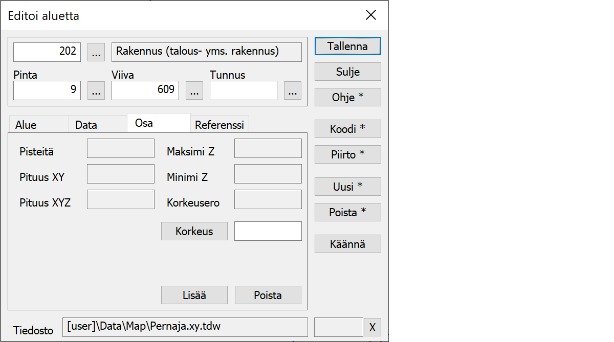 Editoi aluettaAlueiden editointitoiminnot. Alue aktivoidaan osoittamalla hiirellä sen sisäpuolta. Jos mahdollisia alueita on useita, aktivoidaan niistä oletuksena pienin. Jos hakutapa-asetus Samat pisteet on päällä, avataan lista alueen valinnalle.