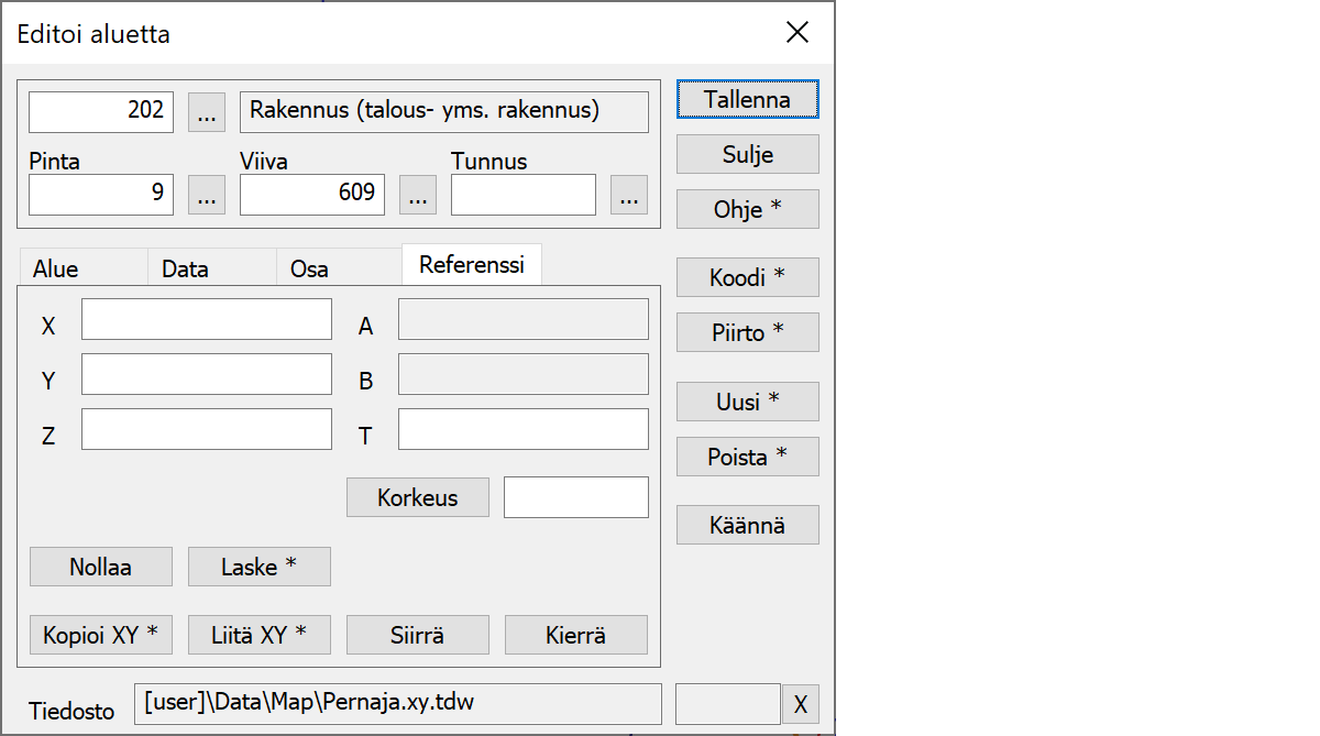 Alueen referenssipisteen koordinaatit. Jos ne on määritelty, alueen ominaisuudet näytetään niissä. Muutoin alueen ominaisuudet näytetään viivan vierellä.