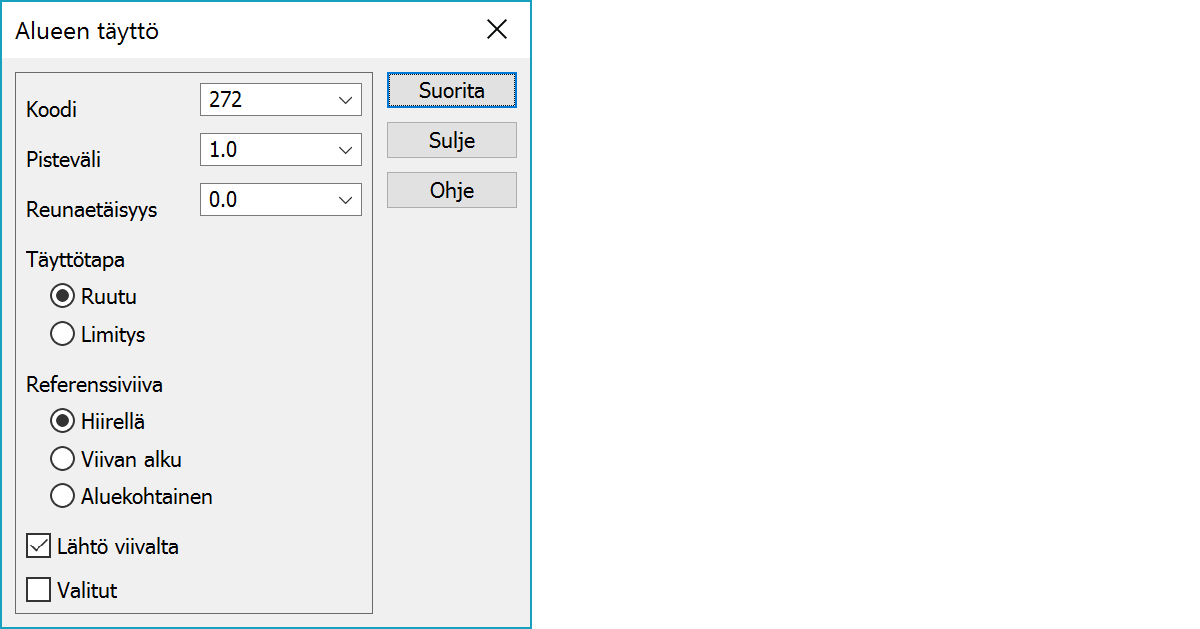 Alueen täyttöTäyttää sulkeutuvan alueen hajapistesymboleilla. Toiminto käy läpi aktiivisen tiedoston kaikki alueet tai vain sen merkityt alueet.