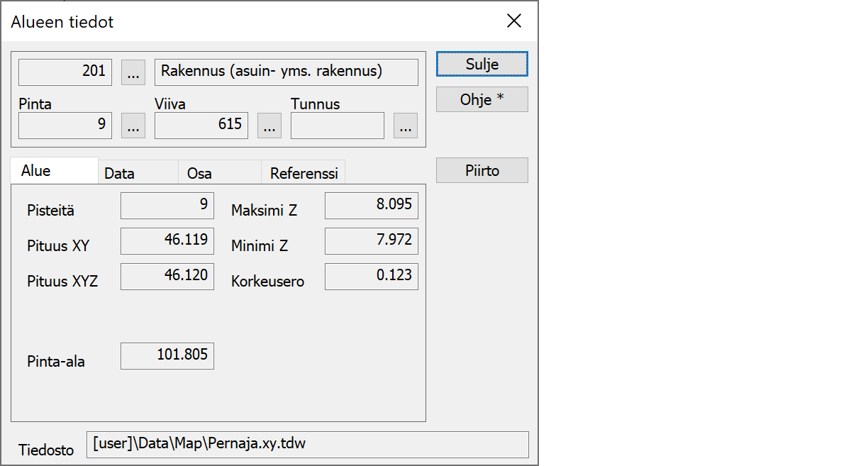 Alueen tiedotNäyttää alueen tiedot. Alue aktivoidaan osoittamalla hiirellä sen sisäpuolta. Jos mahdollisia alueita on useita, aktivoidaan niistä oletuksena pienin. Jos hakutapa-asetus Samat pisteet on päällä, avataan lista alueen valinnalle.