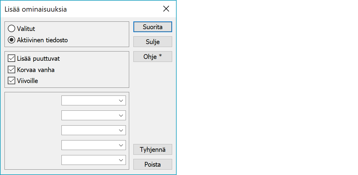 Lisää ominaisuuden niille pisteille, joilla ei vielä ole ko. ominaisuutta. Jos tämä rasti ei ole päällä, uusia ominaisuuksia ei lisätä.
