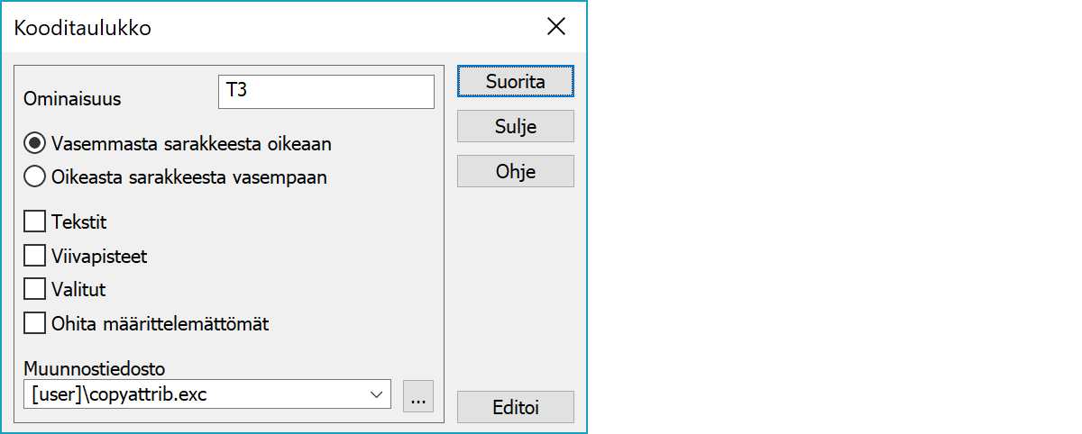 Koodien vaihto muunnostiedostoa käyttäen. Vaihdossa käytetään muunnostiedostoja, joita voit itse luoda tarpeen mukaan. Toiminto kohdistuu aktiiviseen elementtiin. Vaihto voidaan kohdistaa mihin kenttään ja kumpaan suuntaan tahansa.