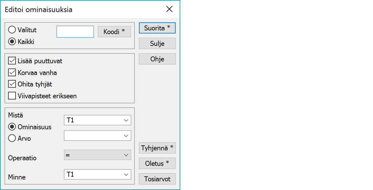 Jos painat Shift-Oletus, toiminto lisää kooditiedostossa määrätyt kaikki ominaisuudet pisteelle tyhjinä arvoina. Jos pisteellä on jo jokin ominaisuus, sen arvoa ei muuteta.