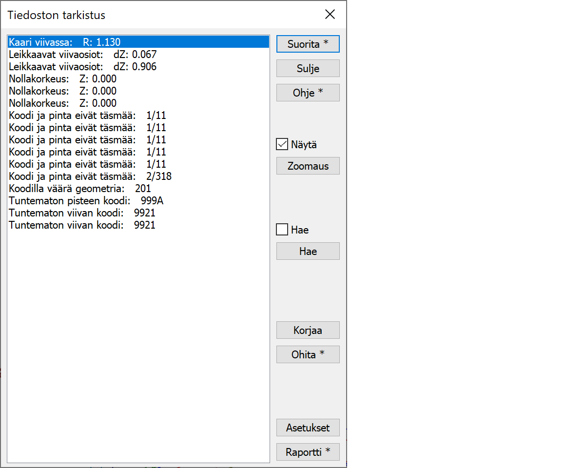 Shift-näppäimen kanssa raportin loppuun eritellään jokainen virhe koordinaatteineen.