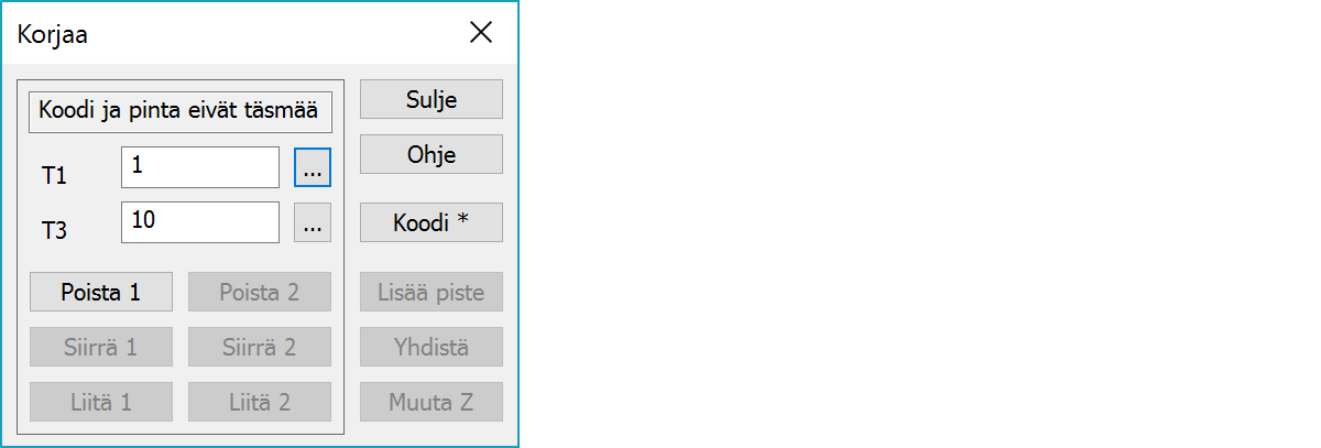 Kentät näyttävät virhekohtaiset tiedot. Jos virhe liittyy koodikenttiin T1 tai T3, voidaan selauspainikkeella hakea uusi pinta tai koodi.