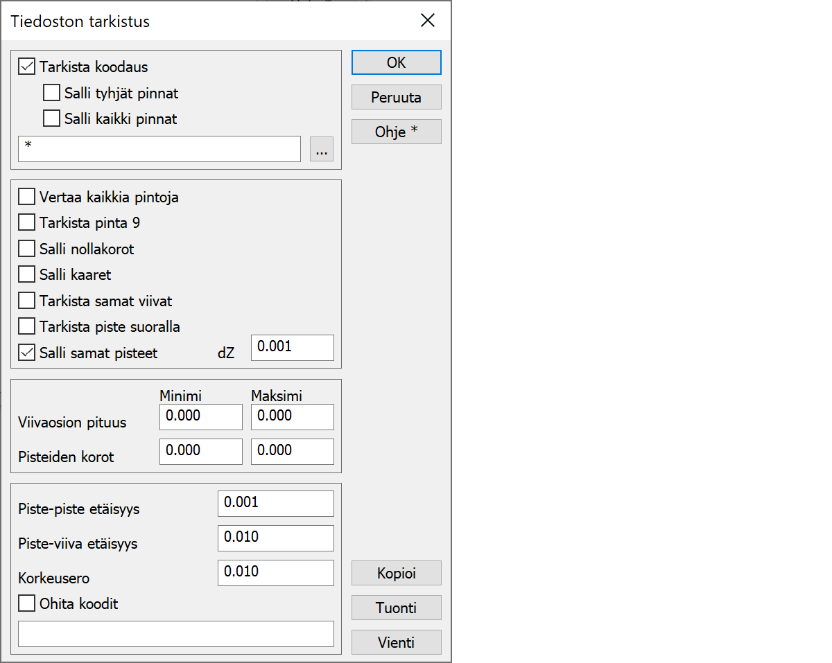 Sallii pisteet, joiden koordinaatit ovat samat. Tällaiset pisteet eivät haittaa maastomallin luontia. Toleranssiarvo dZ on suurin sallittu korkeusero.