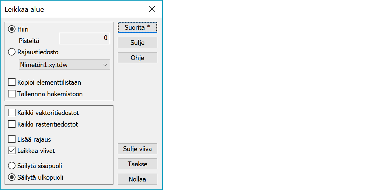 Leikkaa alueen käyttäen hiirellä annettua rajausta. Alt+Suorita katkaisee viivat leikkausviivan kohdalta poistaen viivaosion, mutta ei leikkaa pois alueen sisä- tai ulkopuolta. Pisteitä-kohta näyttää rajausviivassa olevien pisteiden määrän.