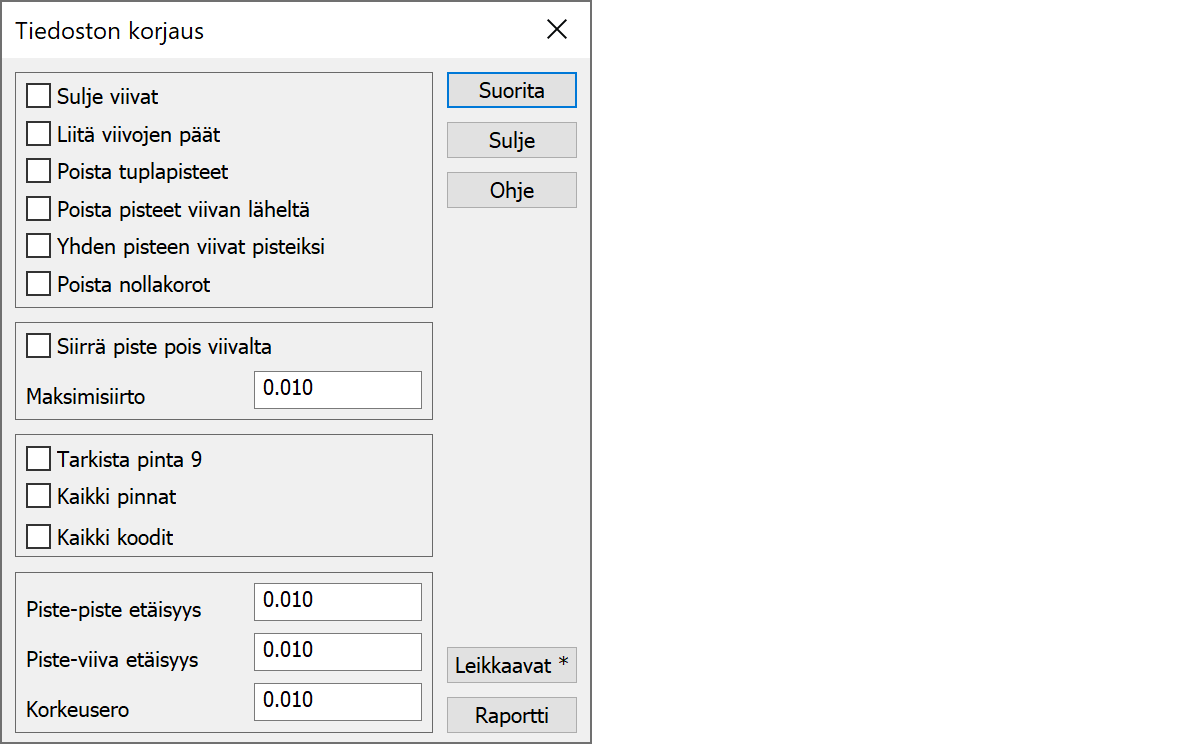 Korjaa leikkaavat viivaosiot ja lähellä toista viivaa olevat viivanpäät lisäämällä uudet pisteet leikkauskohtaan. Oletuksena korjaa vain leikkaukset, joiden korkeusero on vähemmän kuin annettu korkeusero. Shift-näppäimen kanssa toiminto korjaa kaikki leikkaukset. Piste-viiva -etäisyyttä lähempänä olevat viivan päät siirretään ja sitä lyhyemmät osiot viivojen päistä poistetaan.