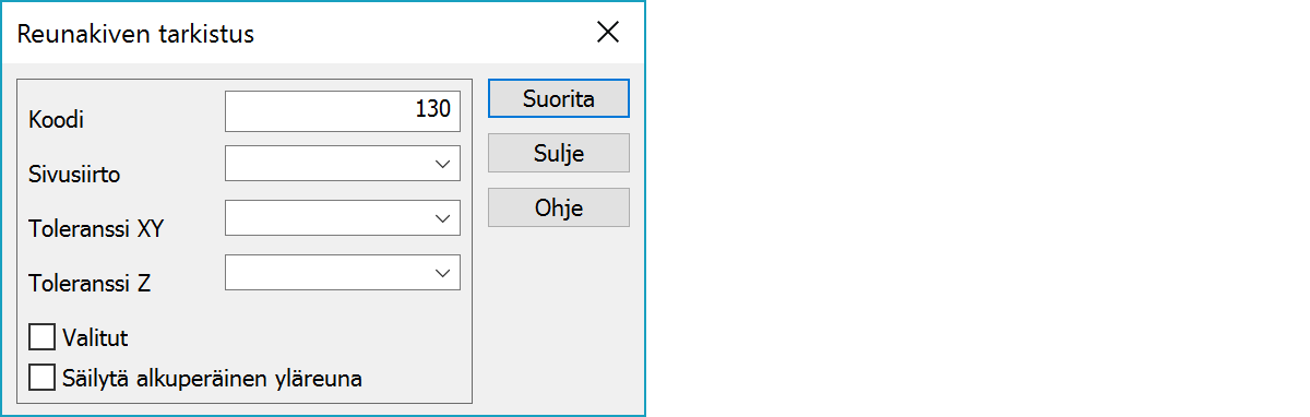 Reunakiven tarkistusLaskee reunakiven yläreunan kopioimalla alareunan annetun sivusiirron verran. Toiminto käyttää kahta viivaa: Ykkösviiva on mitattu reunakiven alareunasta ja sen koodin pitää löytyä toiminnon Koodi-listalta. Kakkosviiva on mitattu reunakiven päältä ja sen on oltava koko matkalla alle 30 cm päässä ykkösviivasta sivusuunnassa. Kakkosviivalta haetaan korko kopioidulle yläreunan viivan pisteille. Kakkosviiva voi olla samalla reunakiven leveys ja tällöin se voidaan jättää aineistoon valitsemalla Säilytä alkuperäinen yläreuna. Kakkosviivan ensimmäinen piste määrää kummalle puolelle ykkösviivaa uusi yläreuna kopioidaan.