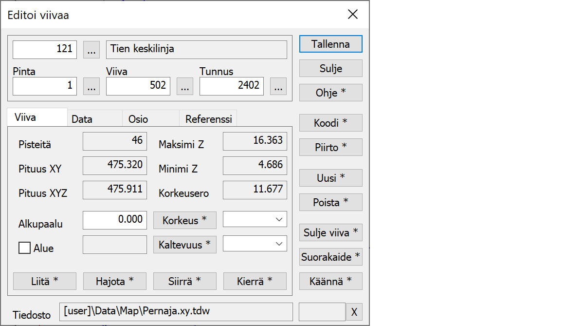 Editoi viivaaViivan editointi. Editoitavaksi viivaksi aktivoituu hiiren klikkausta lähinnä oleva viiva ja sen aktiiviseksi osioksi lähin osio. Jos osoitetaan viivaa päiden ulkopuolelta, aktivoidaan vain päätepiste. Editoitava viiva näytetään editointivärillä ja sen alku- ja loppupäähän piirretään poikittaiset viivasymbolit. Editoitavasta viivasta näytetään myös kaarien keskipisteet sädeviivoineen, suorat kulmat ja mahdolliset piilotetut osiot. Lisäksi aktiivinen pisteväli näytetään eri värillä ja sen keskellä oleva nuoli osoittaa viivan kulkusuunnan. Aktiivinen piste on aktiivisen viivaosion loppupiste.