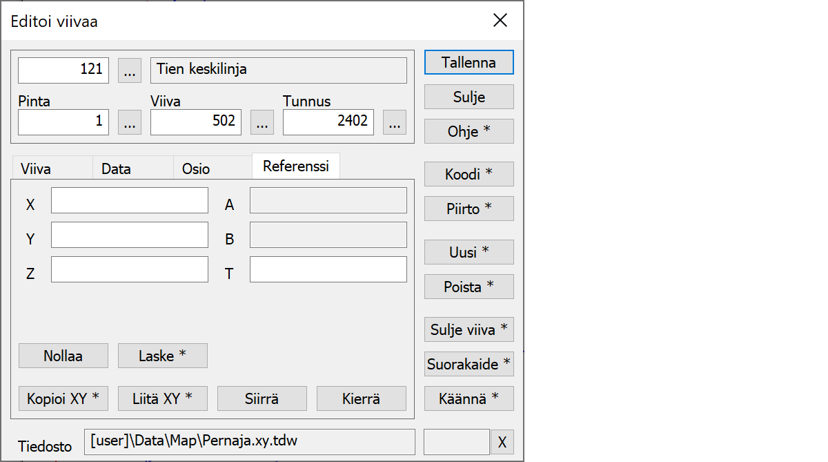 Viivan referenssipisteen koordinaatit. Jos ne on määritelty, viivan ominaisuudet näytetään niissä. Muutoin viivan ominaisuudet näytetään viivan vierellä.
