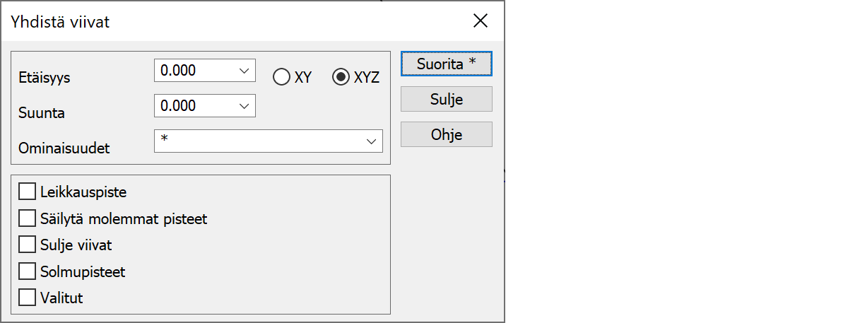 Yhdistää kaikki lähellä olevat viivojen päätepisteet samaan paikkaan. Laskee paikan mahdollista Suunta-asetusta käyttäen, mutta yhdistää sen jälkeen samaan paikkaan myös päätepisteet, joiden suunta ei täsmää.