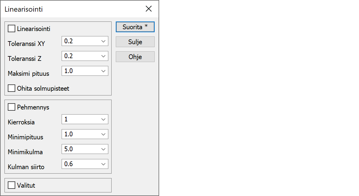 Aktiivisen tiedoston viivat linearisoidaan. Viivoista poistetaan samalla suoralla olevat pisteet. Parametrina annetaan maksimietäisyys, jonka piste saa poiketa verrattavalta suoralta. Vertailu tehdään sekä XY- että Z-suunnassa.